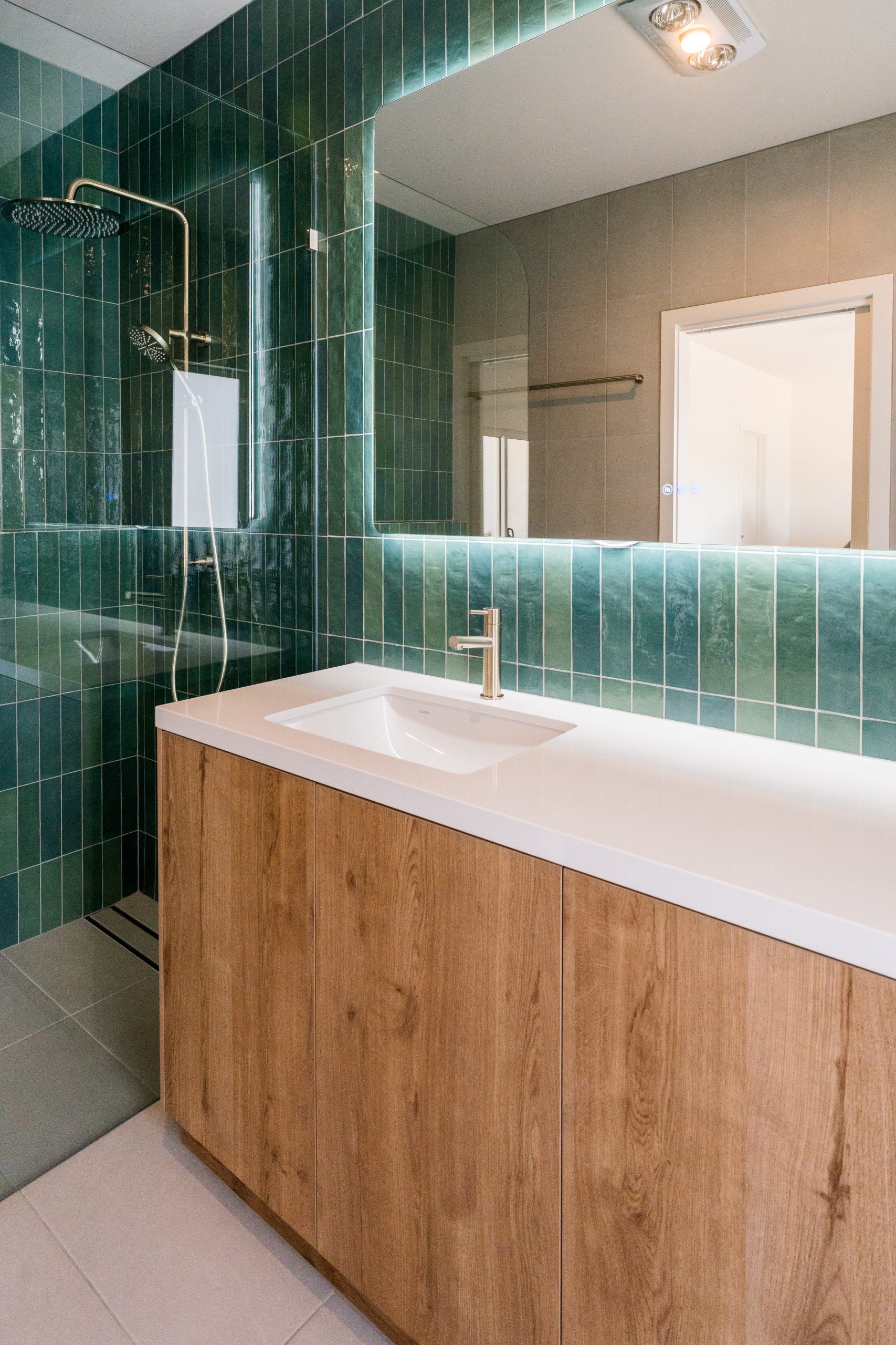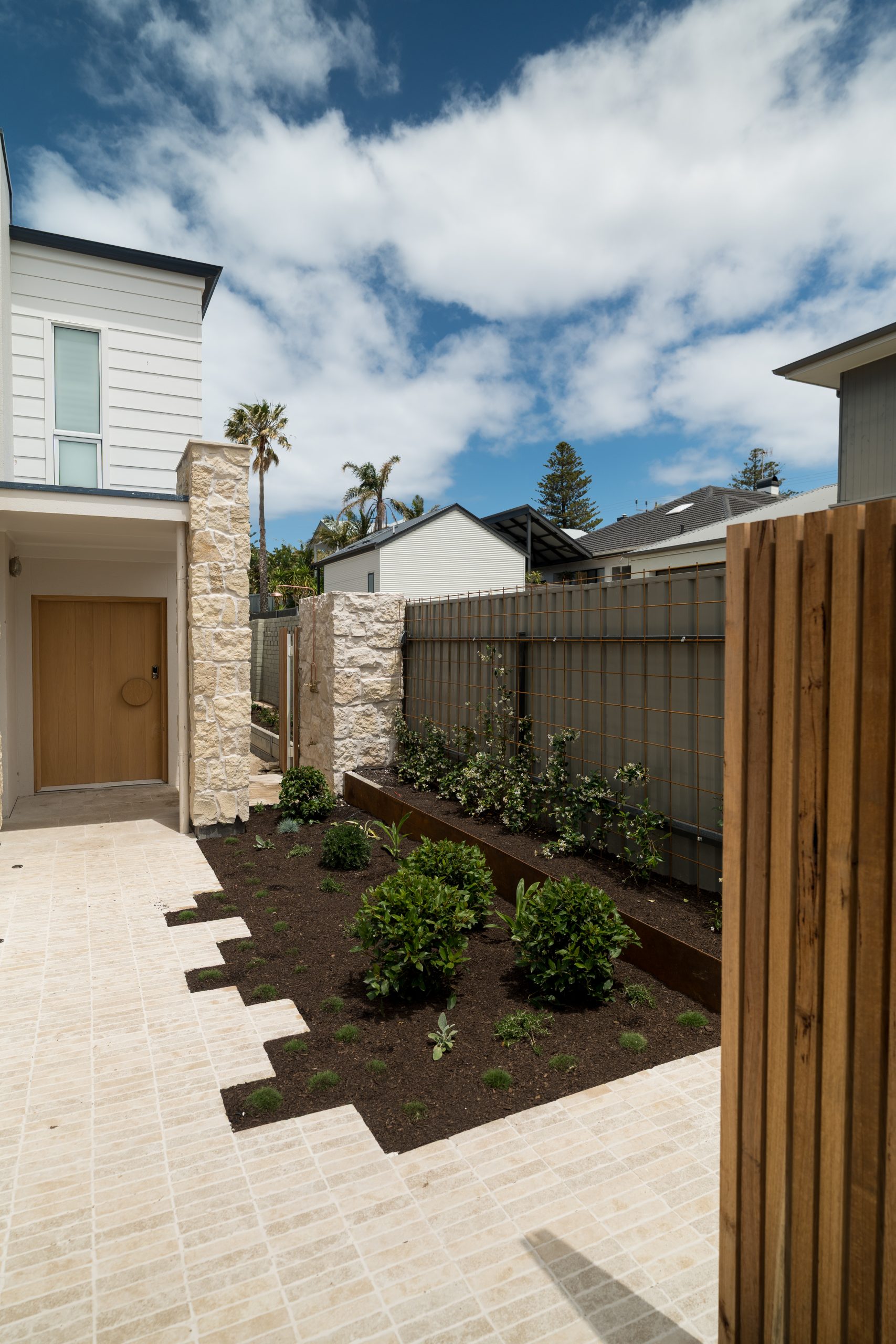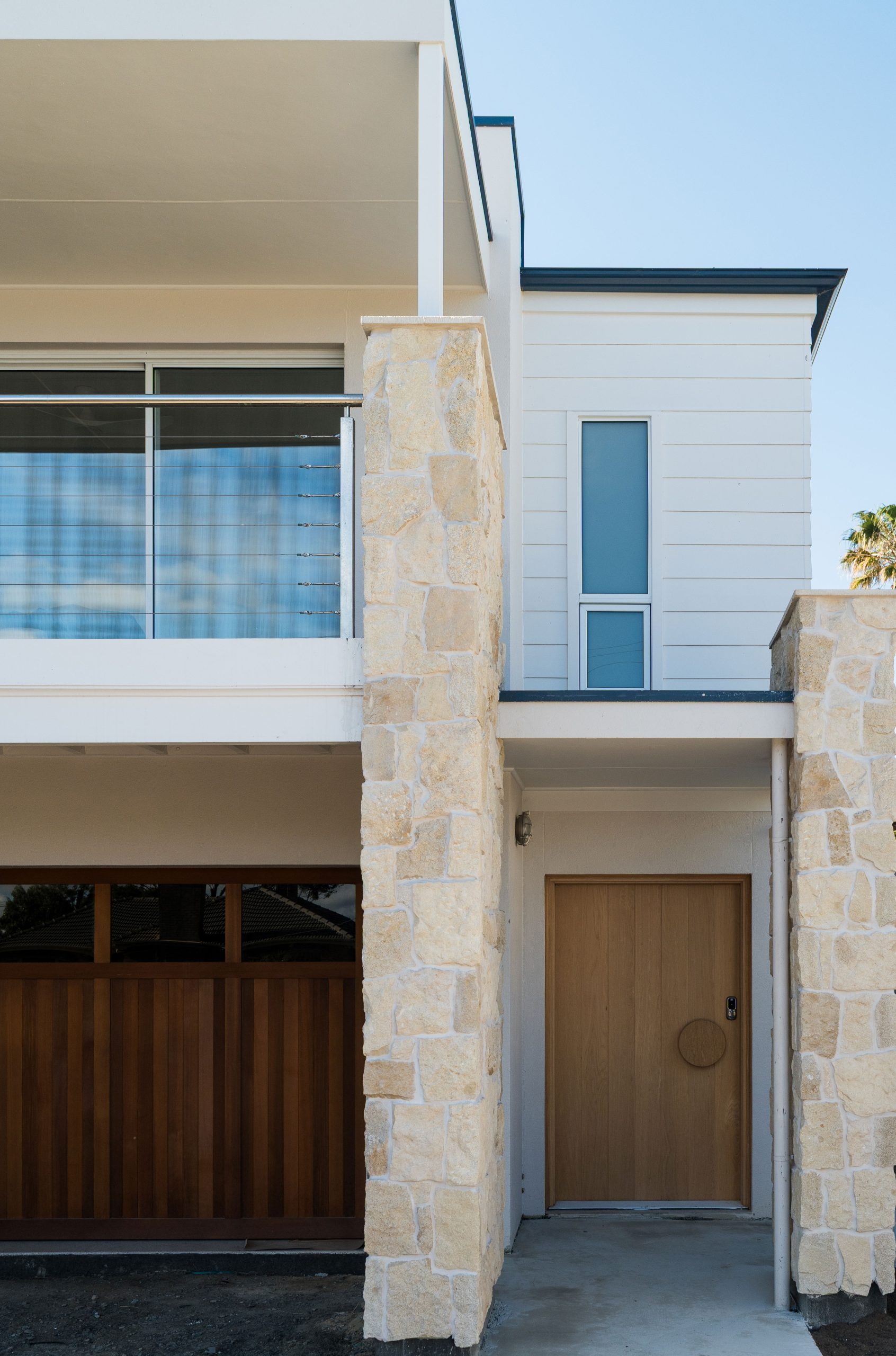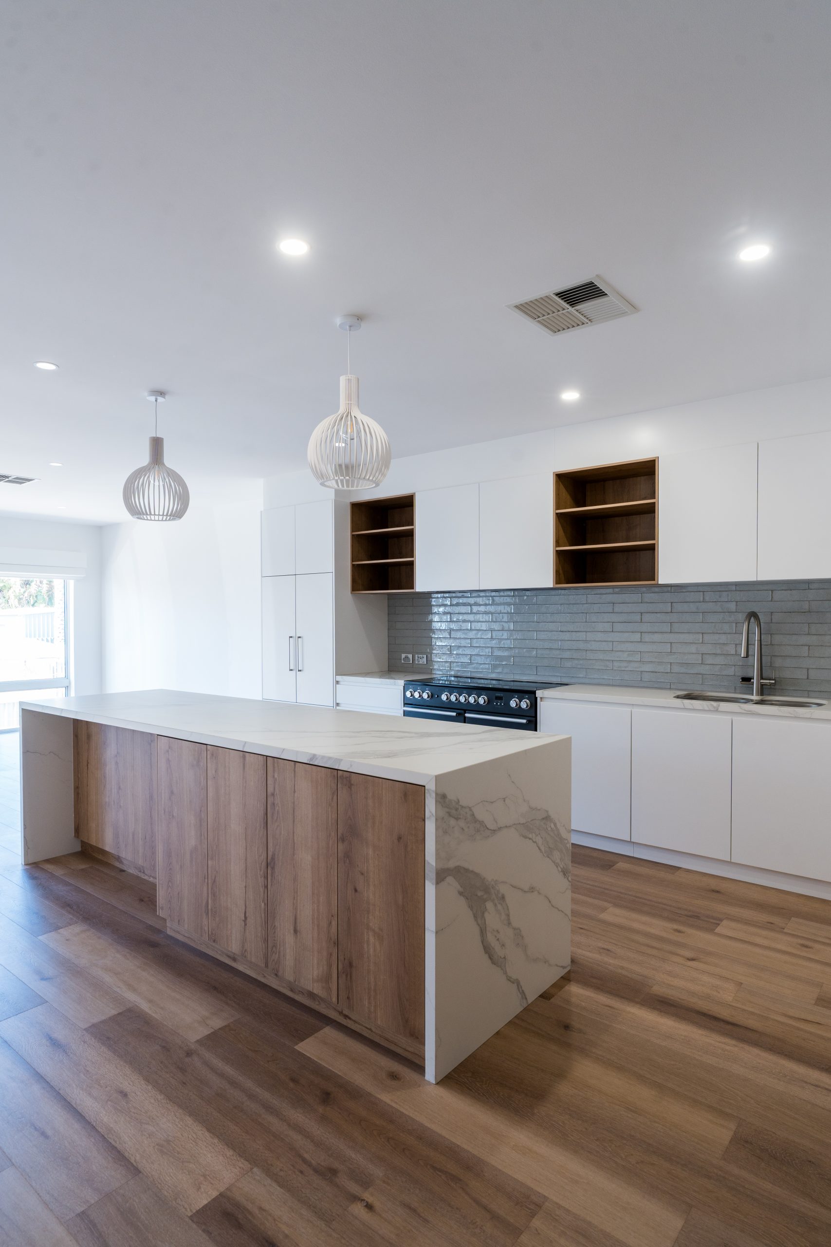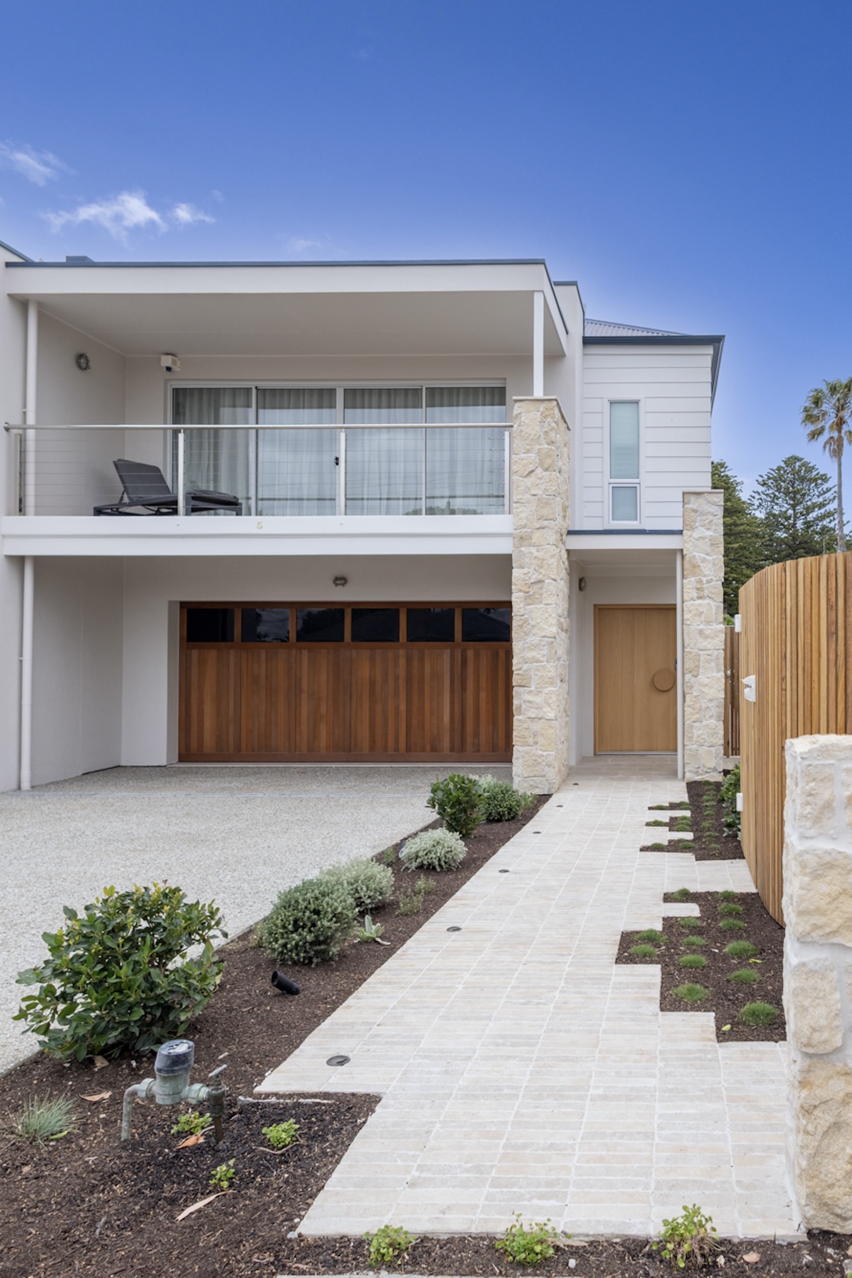 The interior palette brings warmth and coastal character through soft timber tones, stone-look benchtops, textured tiling and crisp cabinetry. Layered lighting, quality fixtures and refined detailing elevate the spaces while maintaining a calm, understated aesthetic.
