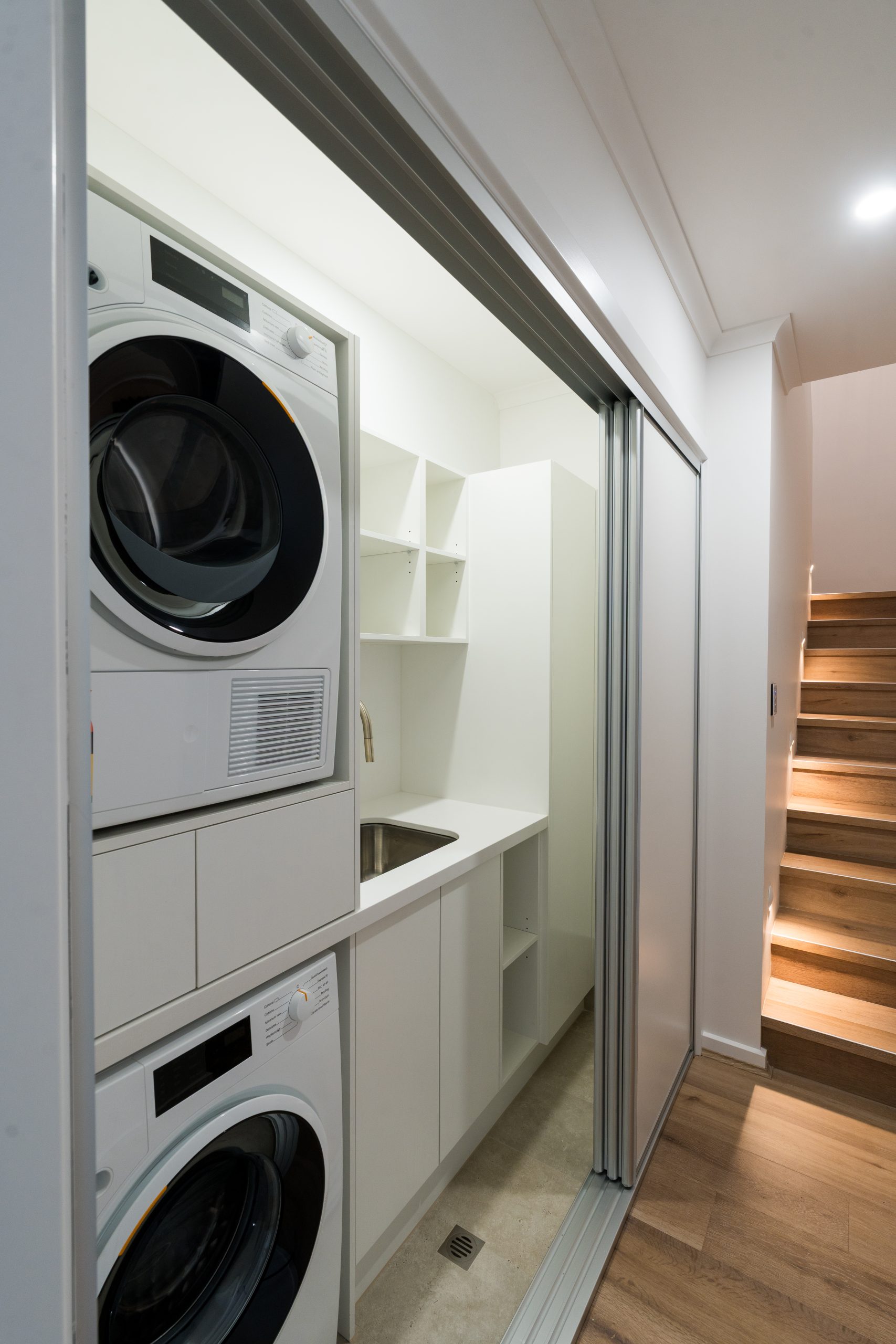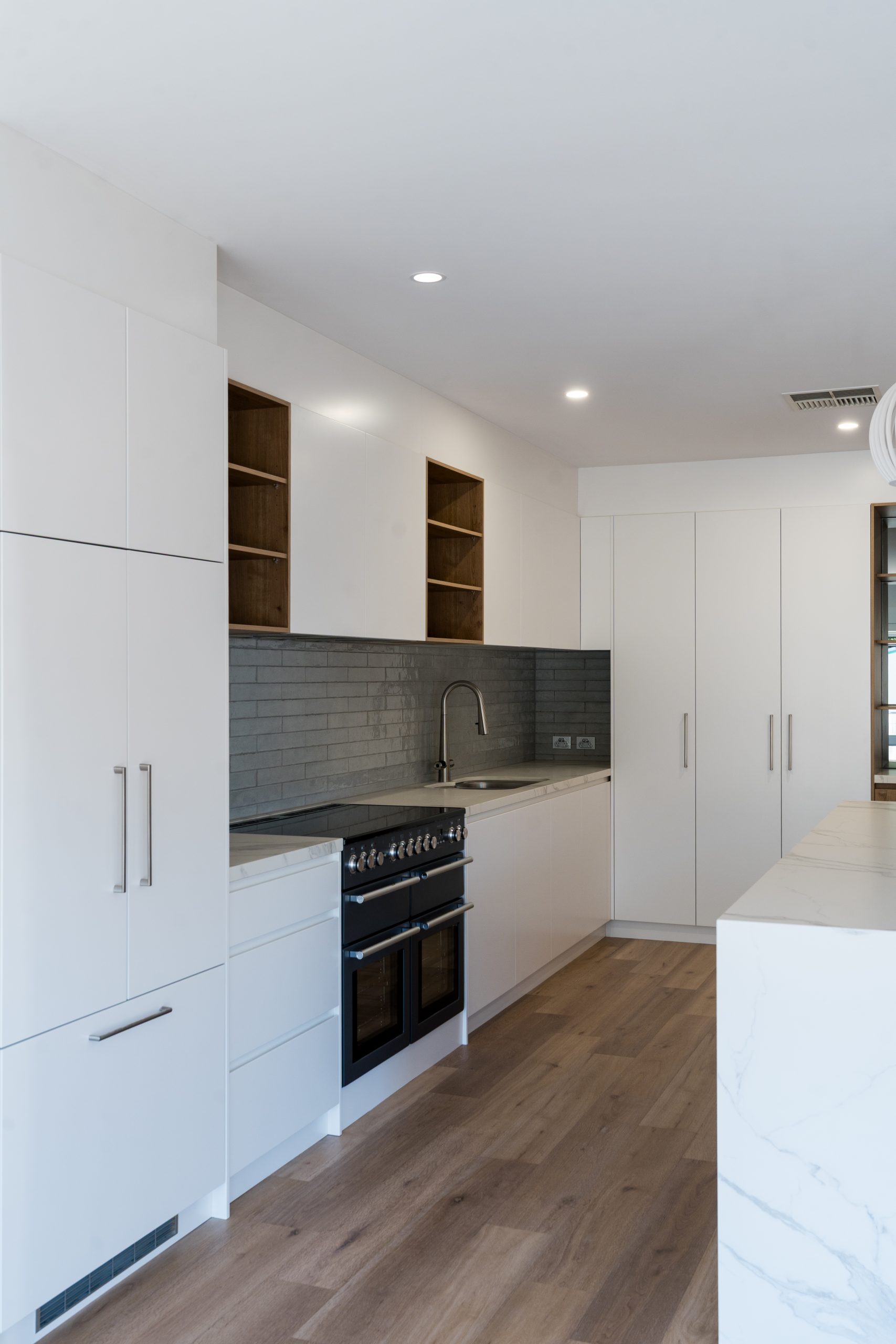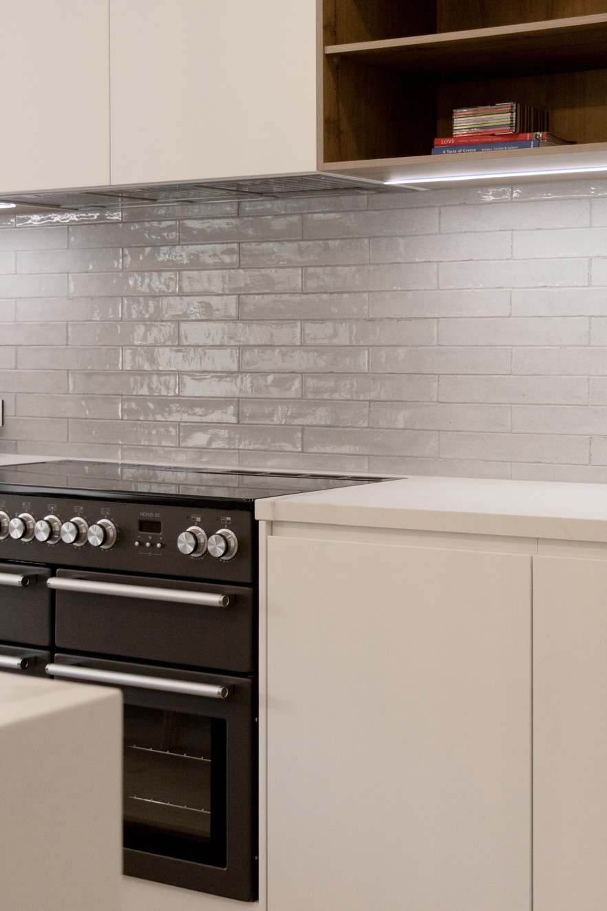 The kitchen now features grey gloss subway tiles, Classic White and Laminex Planked Urban Oak cabinetry, and Caesarstone benchtops, with a new island acting as the home’s central gathering point. Premium appliances include a Falcon induction cooktop, Miele rangehood, microwave and dishwasher, plus a Fisher & Paykel fridge and Liebherr bar fridge.