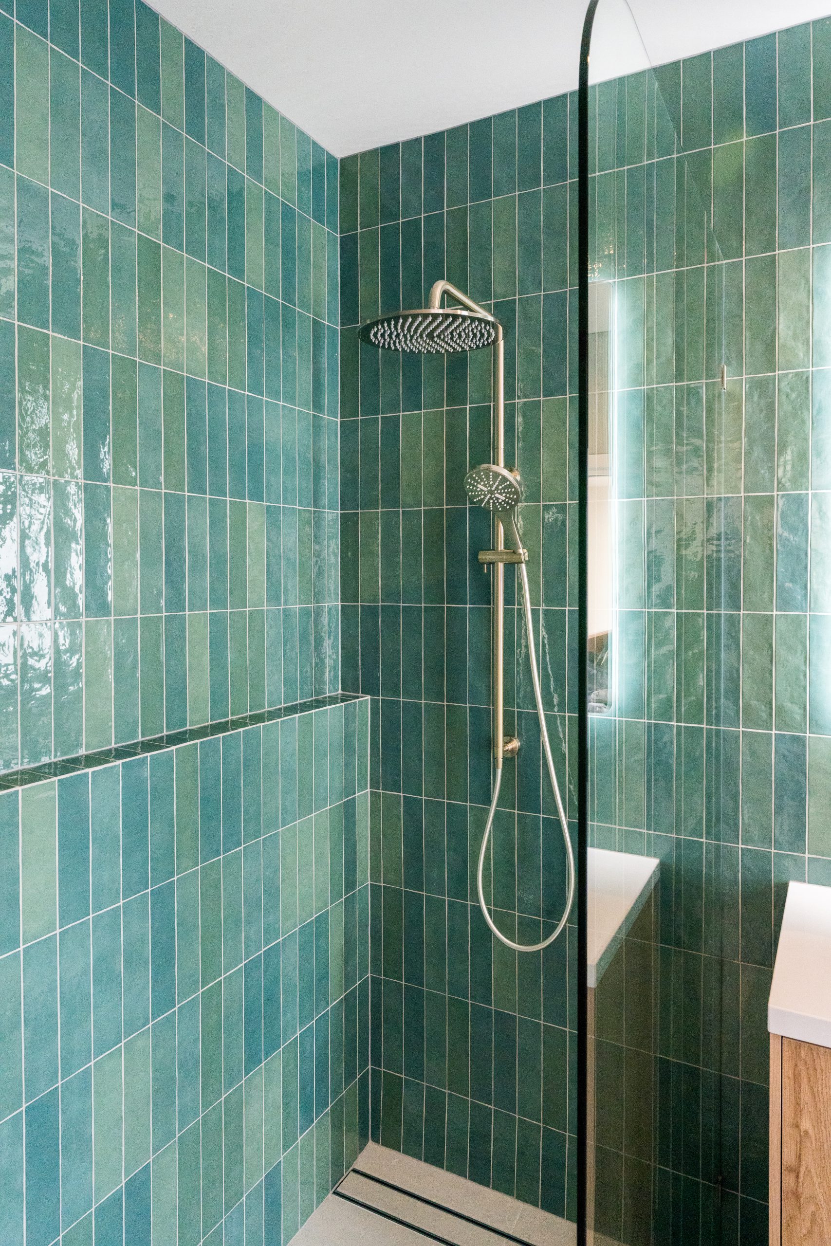 A refreshed powder room brings an elevated experience for guests, showcasing round mosaic feature tiles and clean, modern fittings. Large doors open onto the reimagined balcony, extending the upper-level living space outdoors.