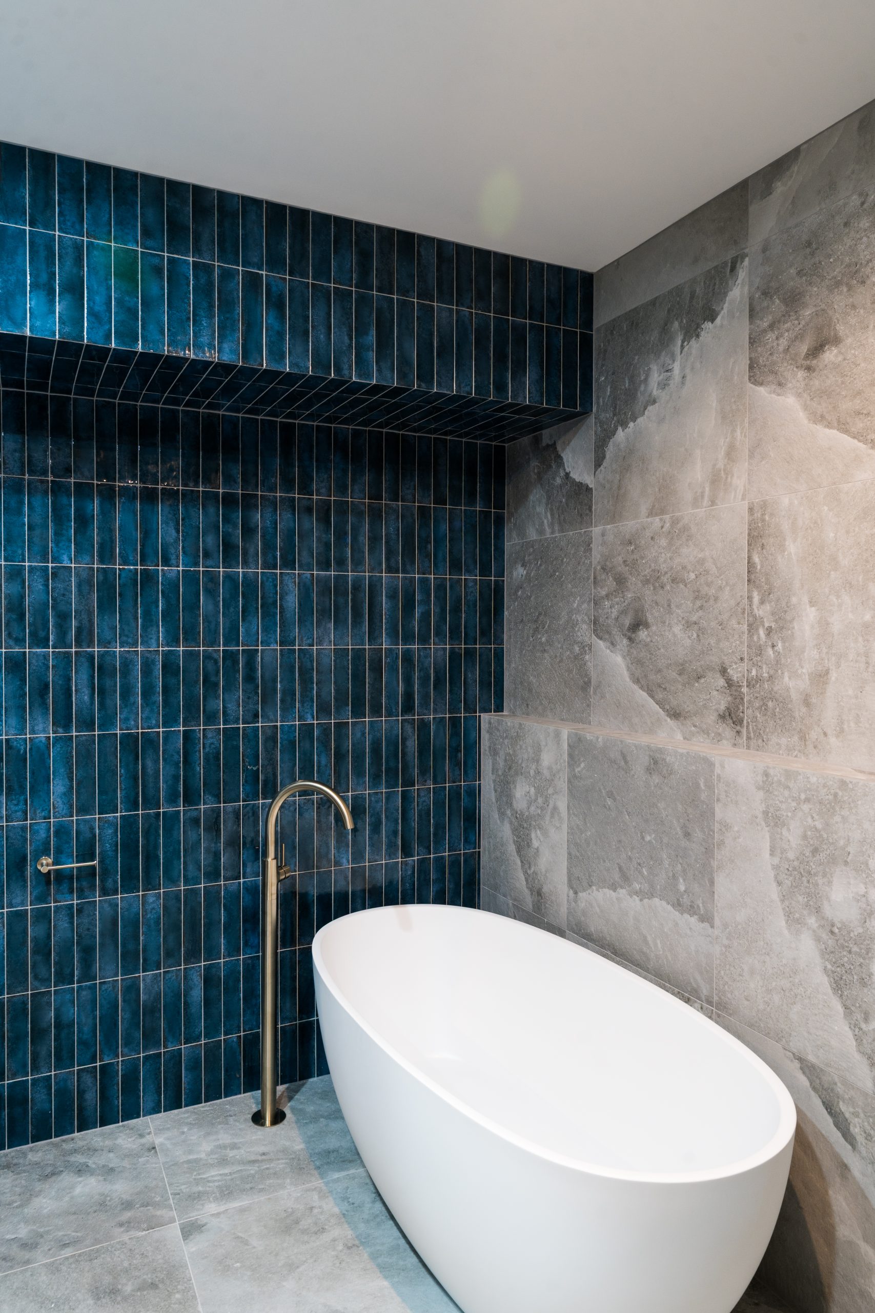 Downstairs, the home continues to evolve with a concealed laundry behind sliding doors, an upgraded staircase, and a revitalised main bathroom featuring a freestanding bath, blue gloss feature tile and stone-look flooring.